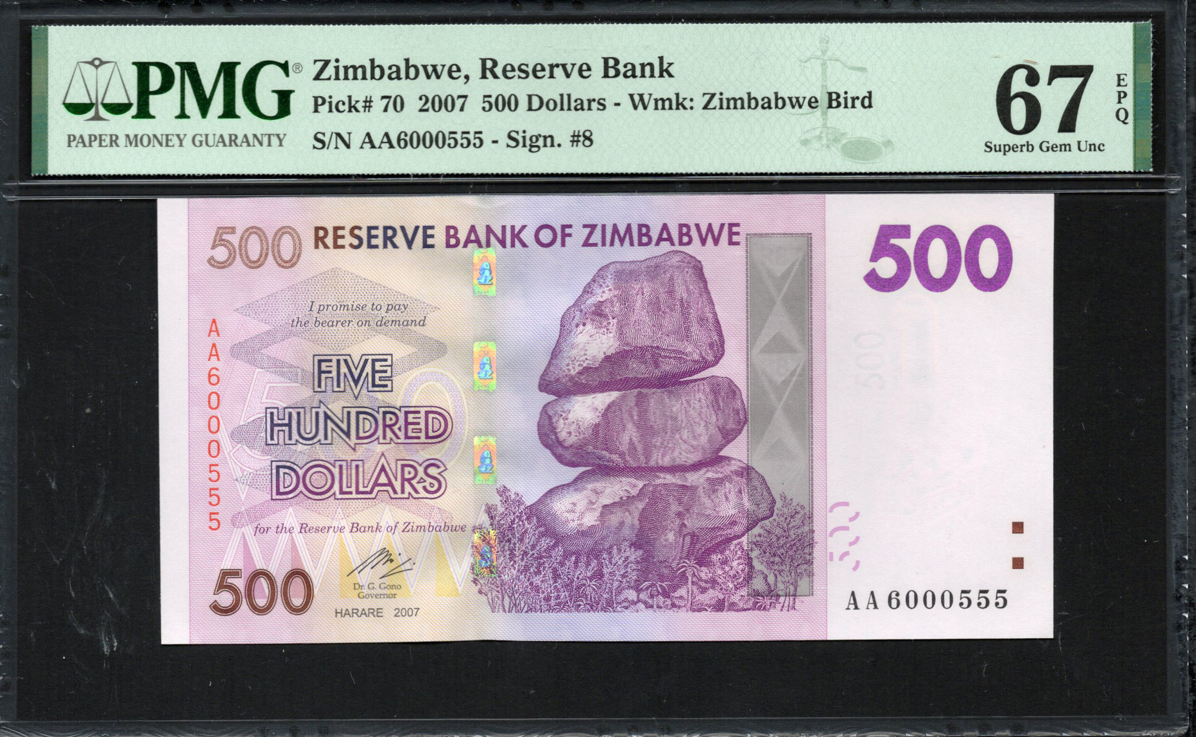 Het 500 Zimbabweaanse dollarbiljet uit 2007 toont opvallende beelden en ingewikkelde designelementen, die het culturele erfgoed van Zimbabwe en de economische toestand van het land in die tijd weerspiegelen. De voorzijde toont prominente tekst die 'Vijf Honderd Dollar' vermeldt en heeft een unieke watermerk van de Zimbabwe-vogel, een belangrijk nationaal symbool. Het kleurpalet van het biljet, gedomineerd door roze en paarse tinten, verhoogt de visuele aantrekkingskracht. Dit biljet is een testament van de historische monetaire beleidsvoering van het land en dient als verzamelobject voor muntenthousiastelingen.