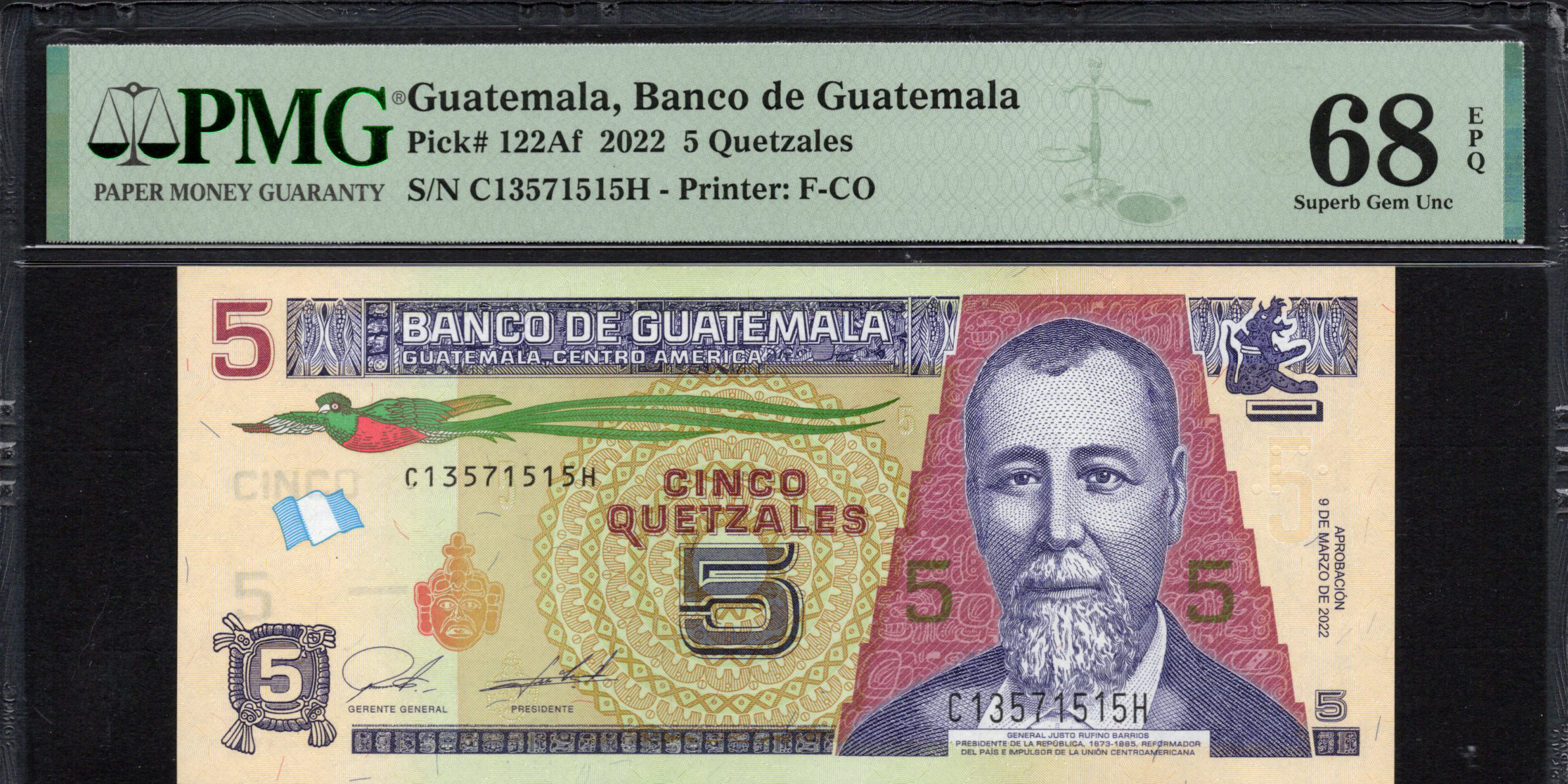 Guatemala - 5 Quetzales 2022 - Pick # 122Af - PMG 68 EPQ