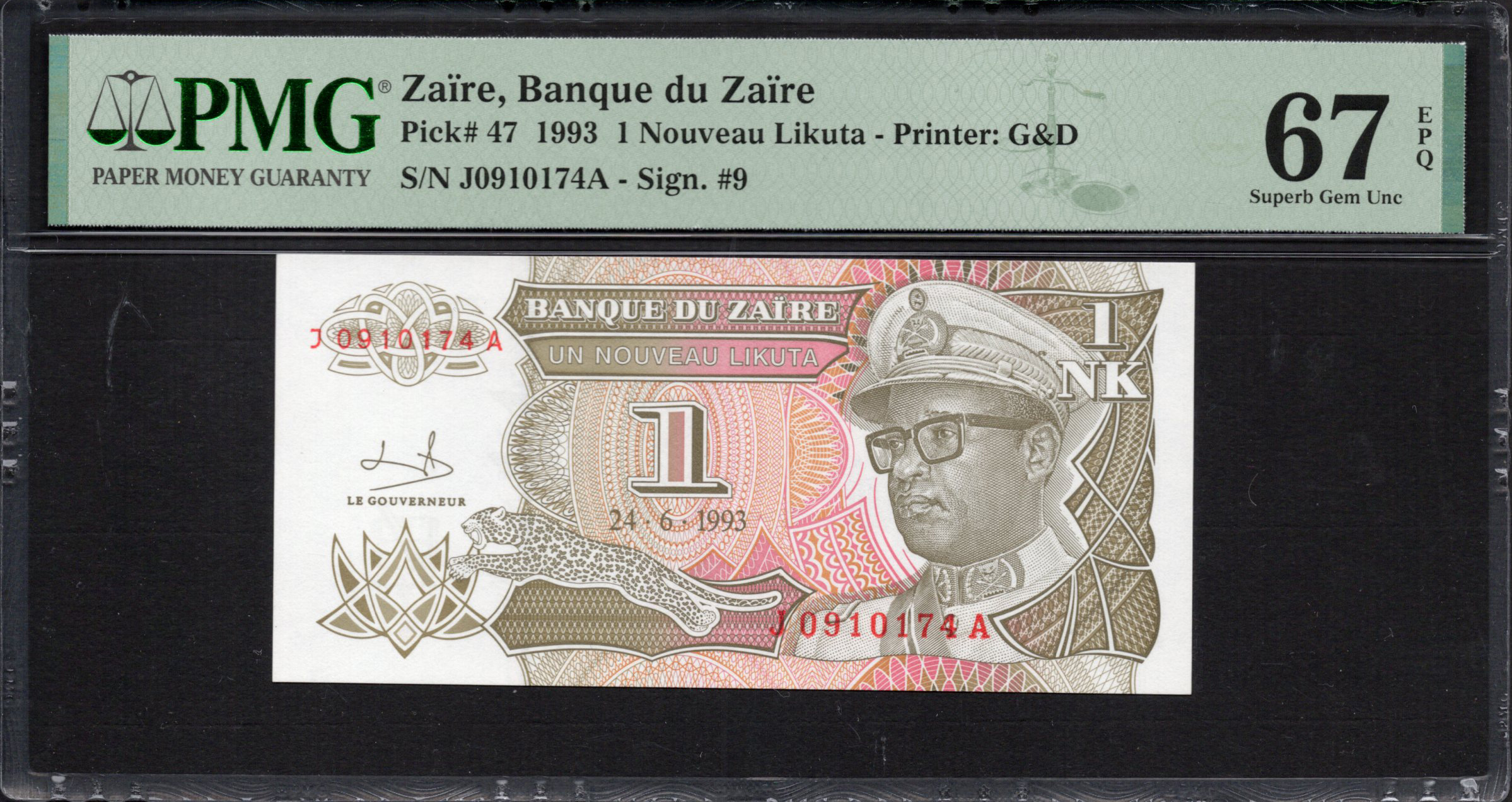 Zaire - 1 Nouveau Likuta 1993 - Pick # 47 - PMG 67 EPQ